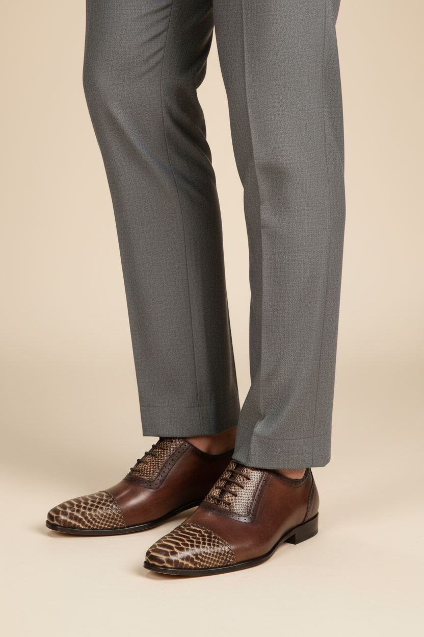 The smooth leather quarters provide a refined contrast, while precise stitching and a closed-lace Oxford construction ensure a sharp, formal profile. Finished with a durable leather sole and a comfortable cushioned insole, these shoes deliver all-day comfort without compromising on style.