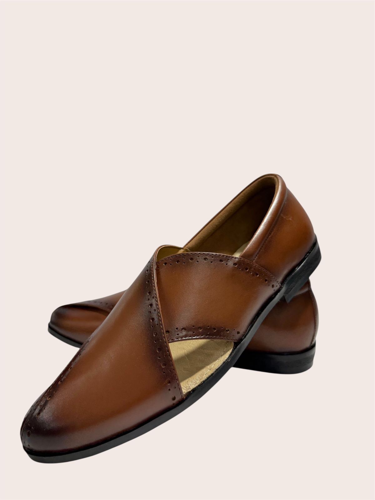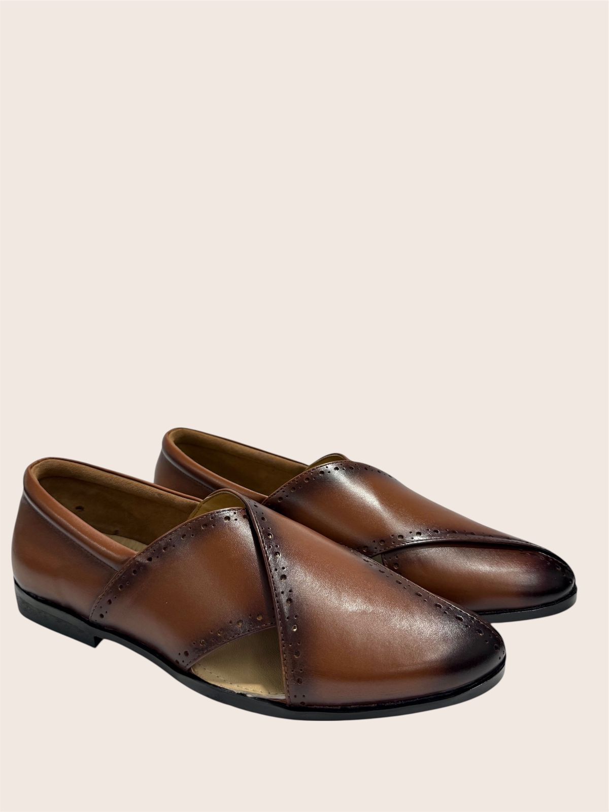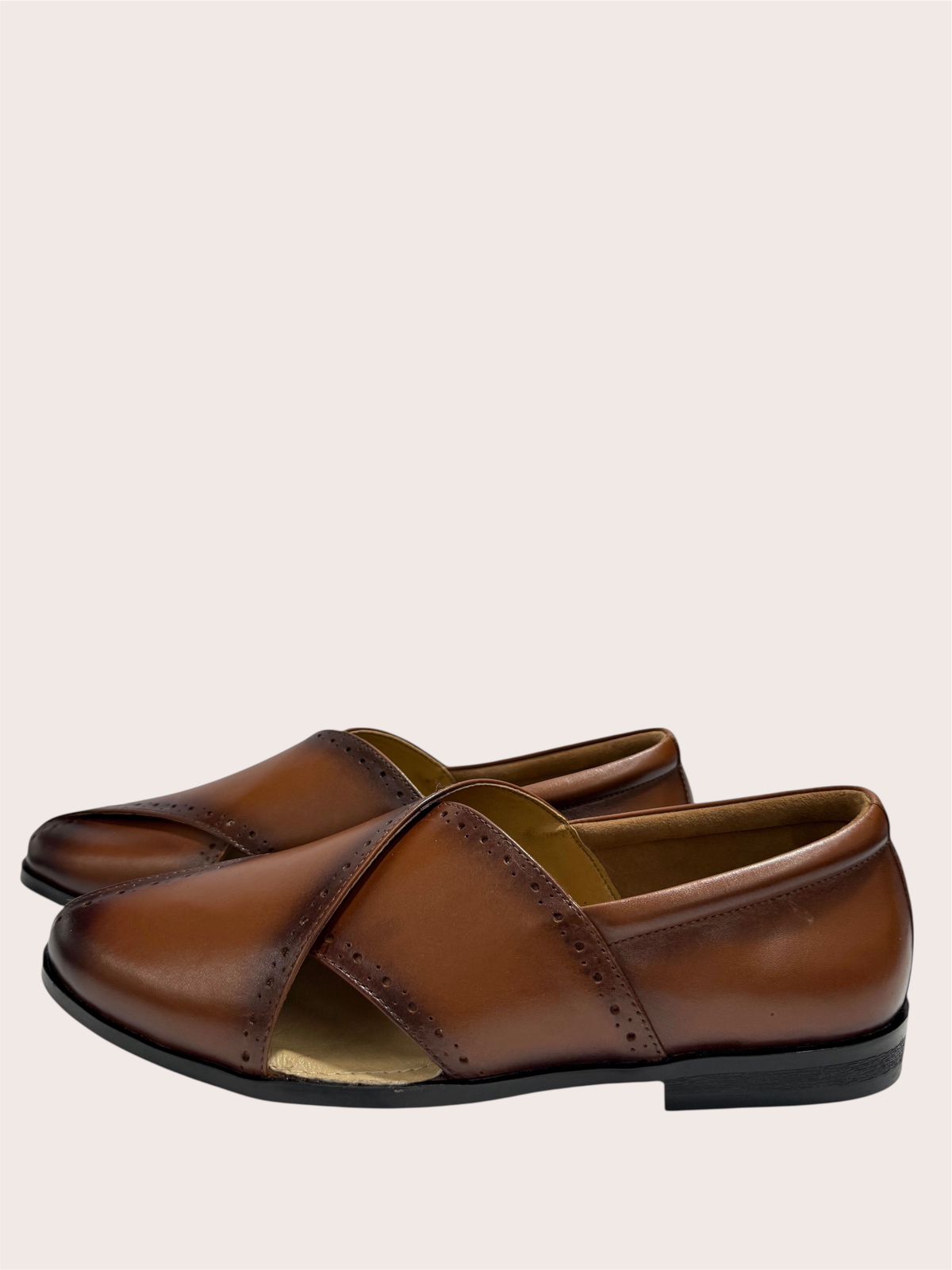 The rich brown shade and unique cross-stitch overlapping design set these shoes apart, giving them a modern yet classic appeal.