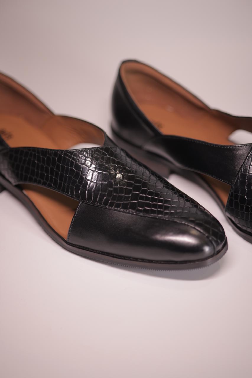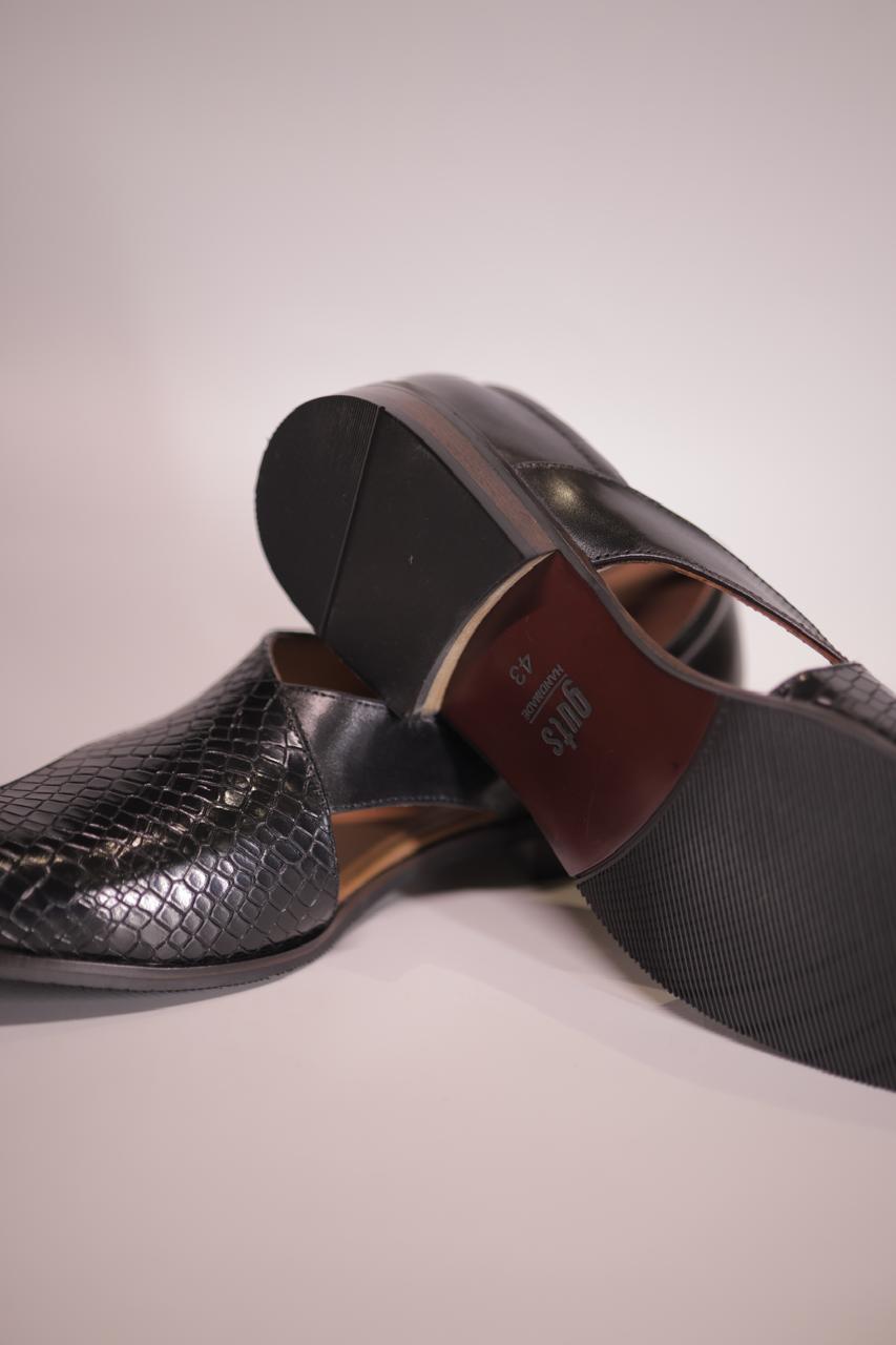 A timeless classic with a modern twist, our Black Leather Peshawari Jutti is a masterpiece of craftsmanship and cultural heritage. Handcrafted from premium genuine leather, this design features a sophisticated croc-textured upper paired with smooth leather panels, creating a striking contrast that elevates any outfit.